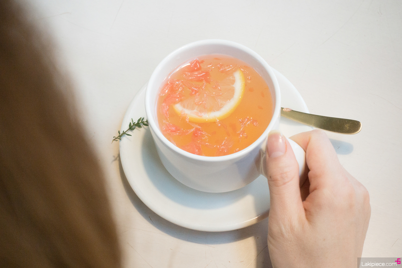 레몬 한 조각과 허브가 동동 떠 있는 자몽차