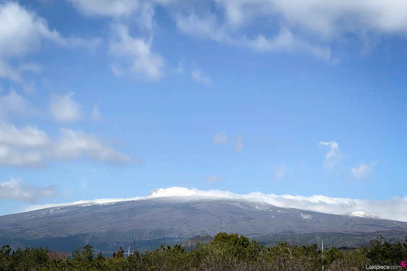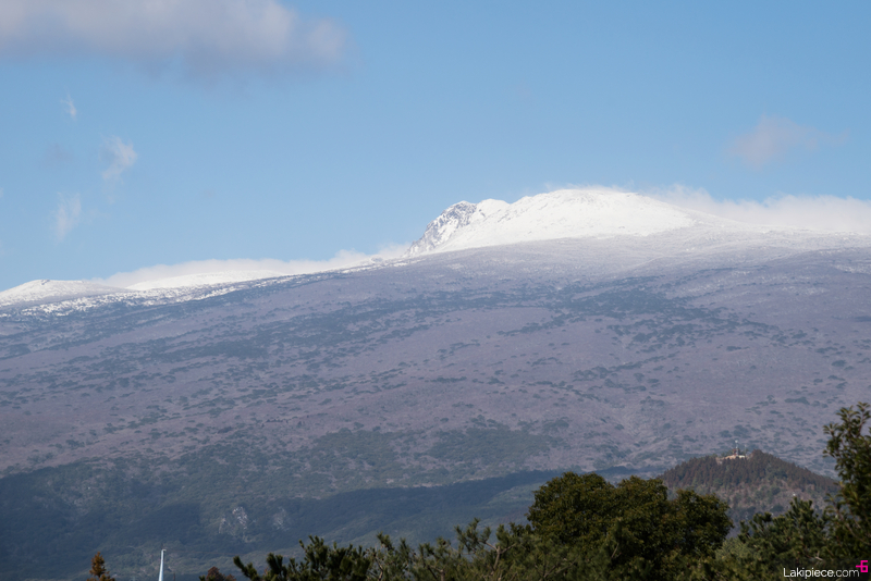 아까보다 구름이 걷혀서 한라산 백록담이 잘 보였다.