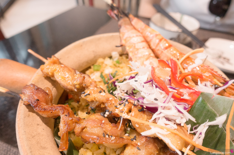 새우 꼬치와 돼지고기 꼬치가 올라간 볶음밥!