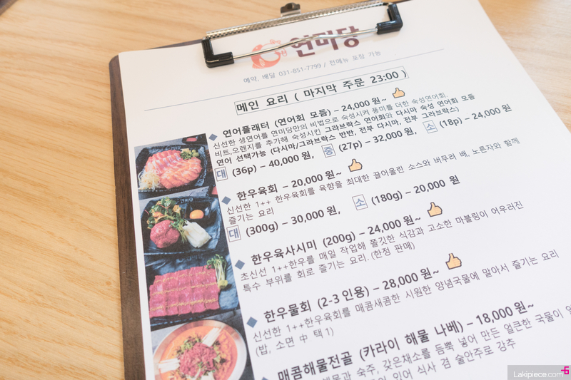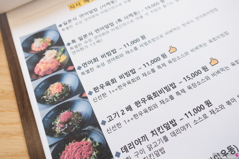 연어회와 한우 육회가 대표 메뉴인 듯!