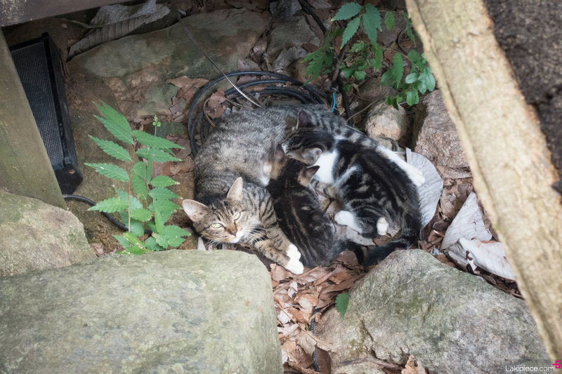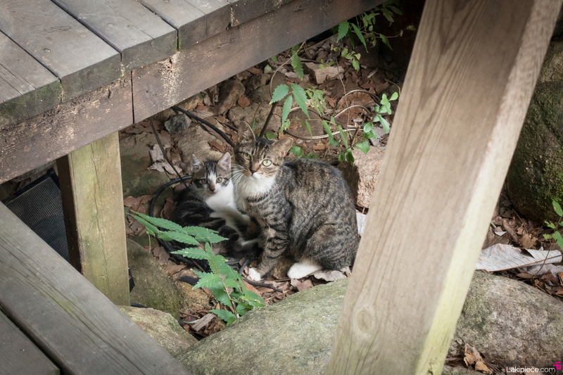 1층 나무데크 아래 공간에 자리 잡고 있는 고양이 가족 구경!