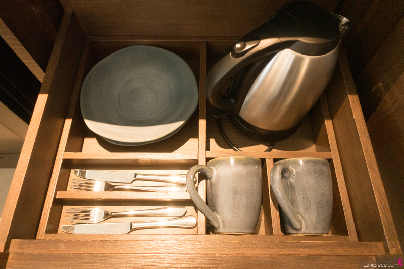 전기포트와 컵, 커트러리 세트 등이 서랍 안에 준비되어 있었다.