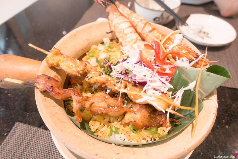 새우 꼬치와 돼지고기 꼬치가 올라간 볶음밥!