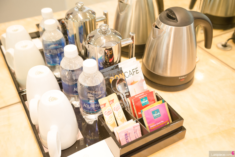 무료로 제공되는 생수와 차, 그리고 유료 미니바 가격표