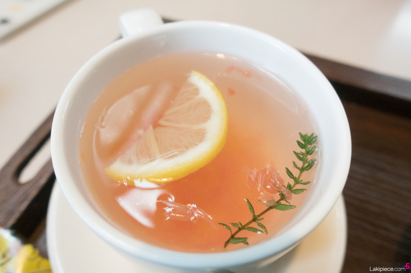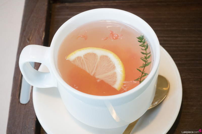 레몬 한 조각과 허브가 동동 떠 있는 자몽차